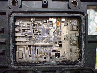 As you can see, there are NO conventional components in the module with the exception of a few surface mount resistors and capacitors. There appears to be a microprocessor (right in the middle in the top half of the picture) but it is a bare silicon chip mounted directly to the circuit board. To the very right are the three thingies that control the three coils. I can only guess that they're proprietary transistors or FETs or something like that. Obviously, there are no remotely servicable parts inside the DIS module. I don't know if you can tell, but the entire thing is filled with a thick water-clear silicone-like goo very similar to what you'd might find in fake hooters. I believe it is designed to act as a thermal conductor allowing the module to cool via the aluminum top and bottom covers.