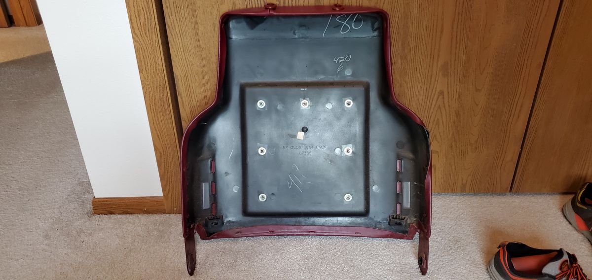 jiggity76 Posted June 22, 2020 Author Report Posted June 22, 2020 (edited) Here's what the seat looks like with the back cover off. You can see the white Christmas tree lock tabs at the bottom on each side of the seat back metal frame. These hold the back cover on. NOTE: This cover on the earlier cars like my 89 International coupe parts car has a different style of locking tabs for the seat cover. They do not use these Christmas trees but use a large metal clip and holder molded into the plastic cover itself. Edited June 23, 2020 by jiggity76 Quote